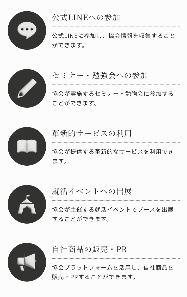 「エリアに差のない技術・知識の浸透させる」「新たな人材の発掘・育成・働き先を繋ぐ」などの活動を通して、この業界に従事する方々の安定した職場環境の確保と社会的地位向上により、業界の更なる発展に貢献していきます。